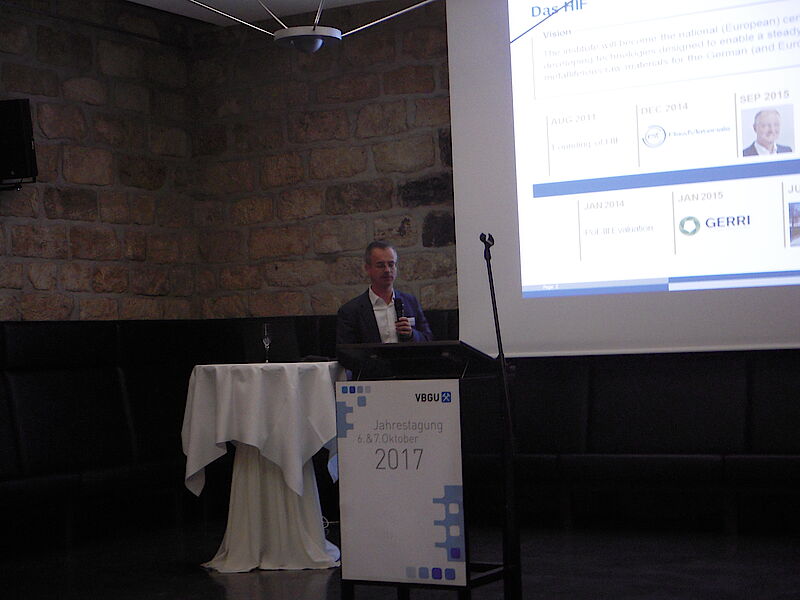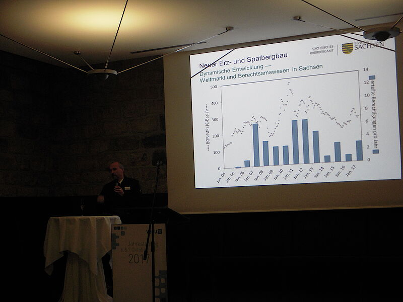 Im Anschluss an das Mittagessen fand das Kolloquium statt. Die Mitglieder und Gäste konnten das Grußwort des Ministers für Wirtschaft, Arbeit und Verkehr, Martin Dulig, der aufgrund seines Urlaubs durch den Abteilungsleiter, Herrn Dr. Dirk Orlamünder, vertreten wurde, entgegen nehmen. Weitere Gäste die der Präsident des VBGU zu dieser Veranstaltung begrüßte waren, der Präsident des Sächsischen Oberbergamtes, Oberberghauptmann Professor Dr. Bernhard Cramer, der Präsident des Landesamtes für Umwelt, Landwirtschaft und Geologie, Herr Dr. Norbert Eichkorn, sowie der Hauptgeschäftsführer des Verbandes der Wirtschaft Thüringens, Herrn Stefan Fauth. Besonders begrüßt wurde auch Herr Dr. Istvan Kalmár, stellvertretender Präsident des Kohleklusters Mecsek, der die weiteste Anreise, aus Ungarn kommend, hatte. Von den Verbandsvertretern kooperierender und befreundeter Verbände konnten die Geschäftsführer des Berufsverbandes Deutscher Geowissenschaftler (Herr Dr. Hans-Jürgen Weyer), der Vereinigung Rohstoff und Bergbau (Herr Dr. Martin Wedig), des Unternehmerverbandes Mineralische Baustoffe (Herr Dr. Steffen Wiedenfeld) sowie der Vorstandsvorsitzenden des Geokompetenzzentrums Freiberg (Herr Dr. Hendrik Gaitzsch) teilnehmen. Vertreter der Universitäten TU Bergakademie Freiberg (Herr Prof. Helmut Mischo) und der Technischen Universität Berlin (Herr Prof. Helmut Wolff) sowie nicht zuletzt die Ehrenmitglieder unseres Verbandes, Herr Dr. Klaus Erler, Herr Professor Dr. Hans-Joachim Kümpel und Herr Dietmar Leupold waren ebenfalls Teilnehmer der Jahrestagung.